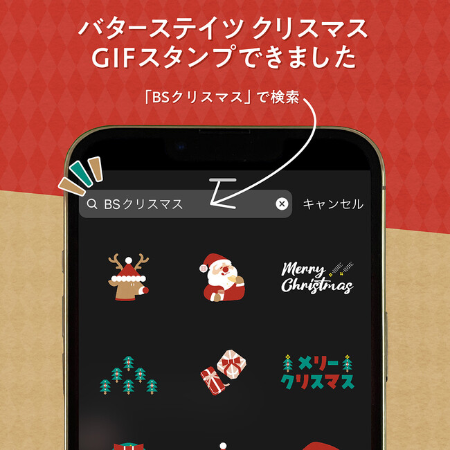 Instagramのストーリーズ投稿画面から、誰でも簡単にご使用いただけるGIFスタンプ。バターステイツのクリスマスギフトのデザインから生まれた、この時期の投稿にぴったりなスタンプばかりです。