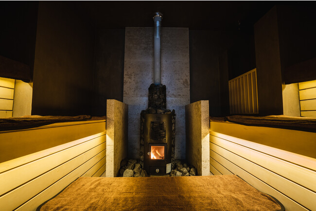 フィンランドから直輸入したmondex社の薪ストーブを中央に構えたサウナ室は、空気の対流設計を綿密に行うことで行息苦しさの少ない“ほど良い温度と湿度”で、短時間でも大量の汗が出る上に、芯から身体が温まります。