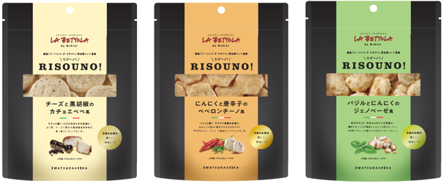 そんな落合務シェフとのコラボレーションでイタリア料理と米菓の出会いから生まれた“新しいBEIKA(米菓)”「RISOUNO!」です。日本のお米【RISO】を楽しく・美味しく!【BUONO!】という想いから名付けられました。今回発売される「RISOUNO!」3種は、日本のお米100%の生地をベースに、チーズやにんにく、唐辛子、バジルなどを使ってイタリア料理の味わいに仕立て、ワインにも合うアンティパスト(おつまみ)に仕上がりました。味だけでなく、生地の特長を生かし、3種それぞれ異なる食感と香り・見た目にもこだわり抜き、日本のお米とイタリア料理の味わいがぎゅっと詰まった、落合務シェフ一押しの商品です。