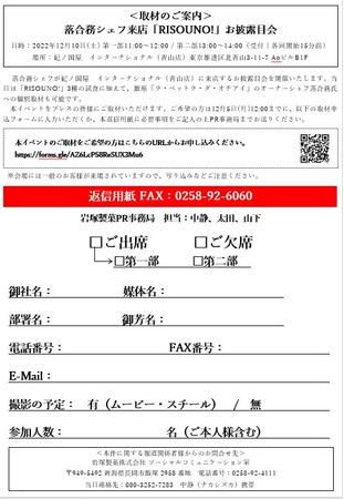 本イベントをプレスの皆様にご取材いただけます。ご希望の方は12月5日(月)12:00までに、以下の取材申込フォームに入力いただくか、本返信用紙に必要事項をご記入の上PR事務局までお送りください。