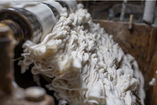 その繊維は水を加えて洗い、ゴミなどを除いたら、まんべんなく広げてシート状に。水分を絞り、6台の大きなローラー状のアイロンの間を通しながら熱で乾かします。