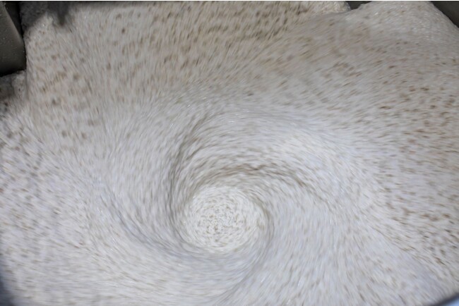 製紙工場では、次のような流れで紙がつくられます。パルパーという大きなミキサーにパルプ(再生紙)とういろを入れて攪拌し、繊維をばらばらにほぐします。