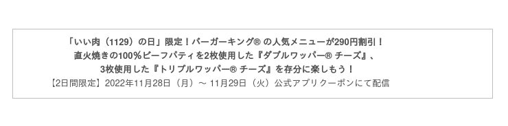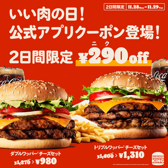 皆様にバーガーキング(R) 自慢の直火焼きの100%ビーフパティをお得にお楽しみいただきたく、「いい肉(1129)の日」にちなんで、人気メニュー『ダブルワッパー(R) チーズセット』と『トリプルワッパー(R) チーズセット』が290円割引になる特別クーポンをご用意しました。クーポンは2022年11月28日(月)~11月29日(火)の2日間限定です。バーガーキング(R) 公式アプリをダウンロードいただき会員登録の上、ご利用ください。