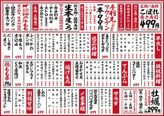 また、お得で幅広いジャンルのメニューをご用意しました。2号店でのみ提供を開始する、生本マグロや、播磨灘産の牡蠣、さらに日本3大和牛である神戸牛を使ったメニューはとくにおすすめです。