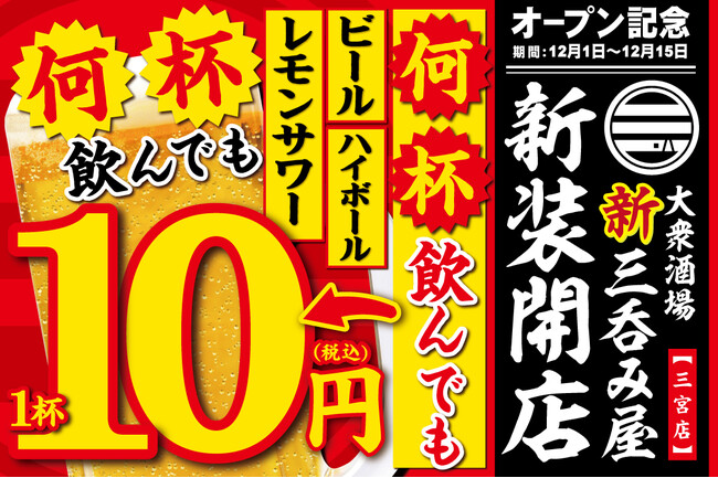 2号店「大衆酒場 新三呑み屋 三宮店」のグランドオープンを記念して、生ビール・ハイボール・レモンサワーが何杯飲んでも1杯10円となるキャンペーンを期間限定で実施いたします。