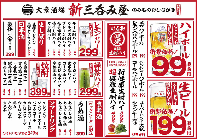 さらに、ドリンクの安さにも自信あり!生ビール199円・ハイボール99円の衝撃価格で提供いたします。