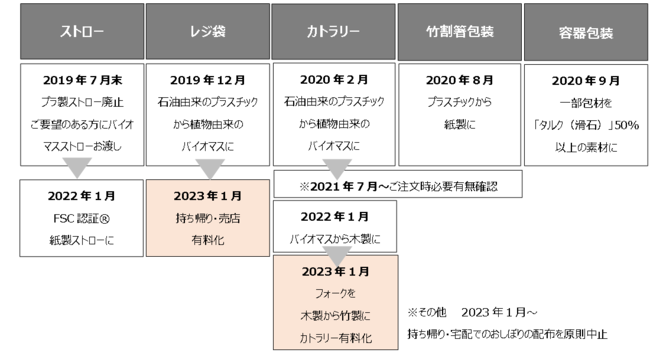 株式会社すかいらーくホールディングス(本社・東京都武蔵野市、代表取締役会長兼社長・谷 真、東証プライム:証券コード3197)は、2018年より段階的に進めてまいりましたプラスチック削減の取り組みをさらに加速するとともに、限りある資源を大切にするため、2023 年 1 月 12 日よりレジ袋とカトラリーを有料化いたします。また、すかいらーくグループ約2,700店舗の持ち帰り・宅配用のカトラリー(フォーク)について、耐久性向上を目的に 木製から竹製に順次変更いたします。