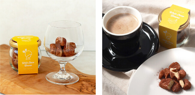 サクサク食感のドライバナナに、ホワイトチョコをたっぷり染み込ませ、仕上げにココアパウダーをまぶしました。今までのカジュアルなバナナスイーツとは一線を画す、贅沢な味わいです。