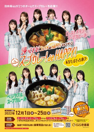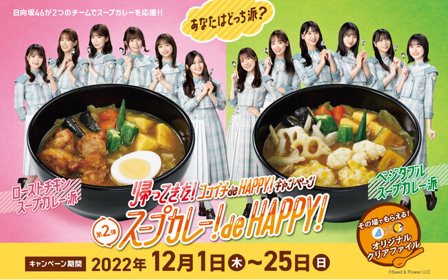 この12月1日からは、キャンペーン第2弾として『スープカレー!de HAPPY!キャンペーン 』をスタートいたします。本キャンペーンでは、同日から販売を開始する期間限定メニューの「ローストチキンスープカレー」または「ベジタブルスープカレー」をご注文いただくと、その場で日向坂46メンバーのオリジナルクリアファイルを先着でプレゼントいたします。
