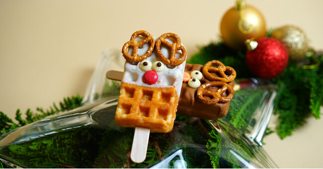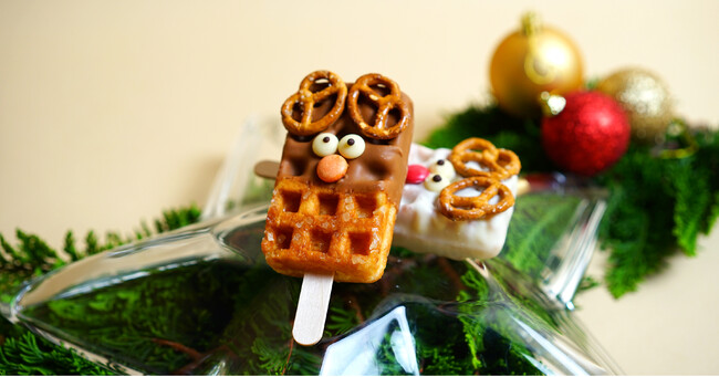 焼き上がった生地には、キャラメルチョコやホワイトチョコをたっぷりとディップ。トナカイの角に見立てたプレッツェル・鼻は赤やオレンジのチョコ、キョロっとした目をトッピング。