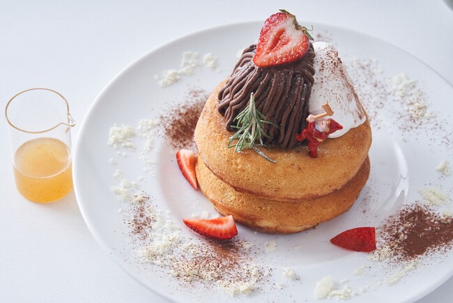 濃厚な塩キャラメルチョコレートのモンブランクリームをたっぷりと絞ったパンケーキに、日本で初めて本格生産した高知県春野町の「土佐ベルガモット」を組み合わせ、華やかで優雅な味わいに仕立てました。塩キャラメルの甘塩っぱさが絶妙なチョコレートの風味に土佐ベルガモットの心華やぐアロマティックな後味。クリスマス気分をよりいっそう彩る、くつろぎの一皿です。