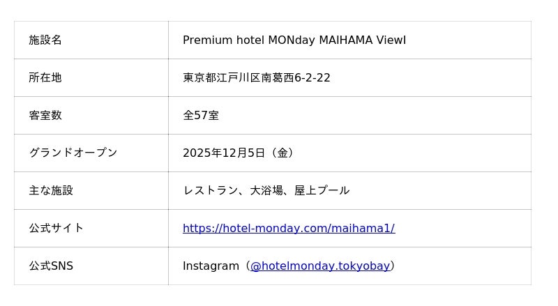 株式会社JHAT(本社:東京都、代表取締役:平林 朗)は、2025年12月5日(金)、東京ベイエリアの絶景と花火を望む屋上プールを備えた新ホテル「Premium hotel MONday 舞浜ビューI」をグランドオープンいたします。国内外から多くの観光客が訪れる東京ディズニーリゾート(R)の近隣に位置し、葛西臨海公園から東京駅(京葉線 約13分)へのアクセスにも優れています。