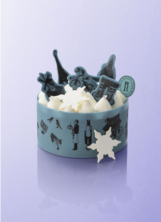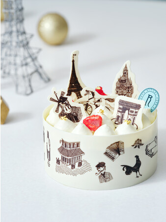 雪道を表現したクリームの上には、版画家・西脇光重氏によるパリを代表するモチーフを乗せ、イルミネーション輝く光の都・パリの街並みを表現しました。アントルメの上に表す“小さなパリ”は、一年の締めくくりに相応しいフェスティブな世界観を演出しています。