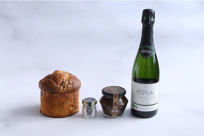 マロンクリームスプレッド (220g)×1個、白トリュフカマルグソルト(30g)×1個、パネトーネ トリュフ<S>×1個、OPIA オピア シャルドネ ノンアルコール スパークリング ワイン(750ml)×1本 計4種
