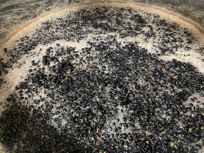2021年はファーストヴィンテージ用の収穫となりました。早生のツヴァイゲルトレーベは、収穫予定日直前の降雨で計画を前倒しで収穫しましたが、ほぼ例年同等の糖度・酸度を計測しました。ツヴァイゲルトレーベは密着房で玉割れしやすい品種なので、ヴェレゾン前の果粒肥大期から収穫直前までの房の管理(果粒を間引く摘粒、病果の除去)が房の健全性を保つ上で重要ですが、今シーズンはこれらをきっちり行うことができ、きれいな房のいい状態で収穫できました。その結果、仕込み時のマロラクティック発酵が終わるまで酸化防止剤を添加しなくても順調に発酵管理を行うことができました。晩生のメルローは、10月中旬、糖度、着色向上を期待して例年より遅めに収穫しました。