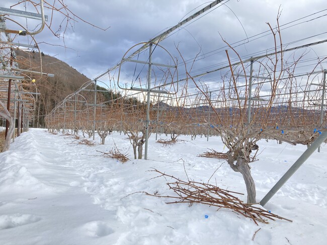 年末から1月前半にかけて厳しく冷え込む日が続き、日照時間は平年より少なく、積雪量は平年より多い、冬らしい冬でした。この時期の圃場は雪深いため、デスクワーク主体で今シーズンの計画作成などを行いました。寒さが和らぎ始める2月下旬ごろから、今シーズンの栽培管理作業の第1番目として、剪定作業が始まりました。