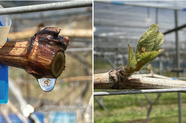 3月は暖かな晴天の日が続き、雪解けが一気に進みました。剪定は3月末までには終わらせ、続いて4月中旬までにぶどうの樹の古い樹皮を剥ぎ取りました。3月下旬になると剪定した枝の切り口から樹液が滴り落ち始め、樹が活動していることが見て取れます。