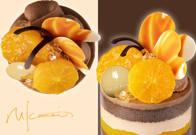 今が旬のミカンの魅力を最大限に引き出した『ミカン・オ・プラリネショコラ』。果皮と果肉を優しく煮込んだ 自家製みかんコンポートと、ヘーゼル&アーモンドの軽やかなプラリネムースを カカオ香るやわらかなスポンジに合わせました。トップには濃密なプラリネショコラクリームと、ジューシーな温州みかんをトッピング。みずみずしいミカンの花で羽を休める蝶々がオシャレな冬限定ケーキです。プラリネの香ばしさがミカンの美味しさを一層引き立ててて、コクがあるのにさっぱりとした新しいショコラケーキに仕上がりました。この冬、ぜひ食べていただきたい自慢の新作です。