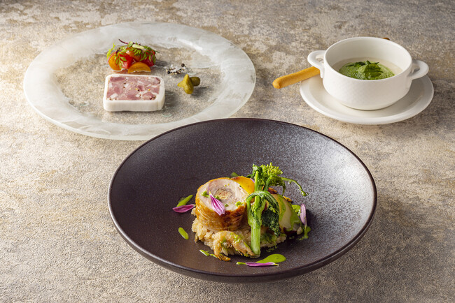 温かい空間のオールデイダイニング「セリーズ」のシェフ矢口健太がご用意するのは、北陸の豊かな自然の恵みを享受した魚介、肉、野菜を使った5種類からメインを選べるディナーコース。ジューシーで柔らかい越前鶏と口に入れるととろけるフォアグラを合わせ、上品な甘味ととろけるような食感の白エビをリゾットにした「越前鶏とフォアグラのバロティーヌ 白エビのリゾット」、のどぐろと白エビをビールを入れた衣でさっくりと揚げた「のどぐろと白エビのベニエ リングイネパスタと一緒に」など北陸の食材を存分に楽しめるメニューをご用意しました。カジュアルでありつつも落ち着いた雰囲気の中、贅沢なディナーをお楽しみください。