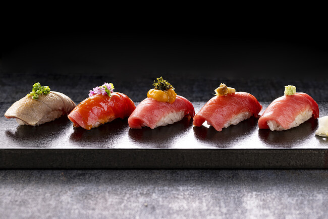 ・ サステナブル鮪の握り5種(炙り鮪、胡麻醤油鮪、鮪雲丹のせ、漬け鮪、鮪) 10,000円
