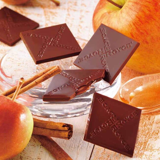 薄く繊細なチョコレートに、シナモンが香るとろりとしたアップルソースを閉じ込めました。チョコレートをぱりんと割ると、りんごのさわやかな香りとシナモンの甘く奥深い香りがあふれ出します。すっきりとしたチョコレートの味わいと、りんごとシナモンの上品なハーモニーをお楽しみください。