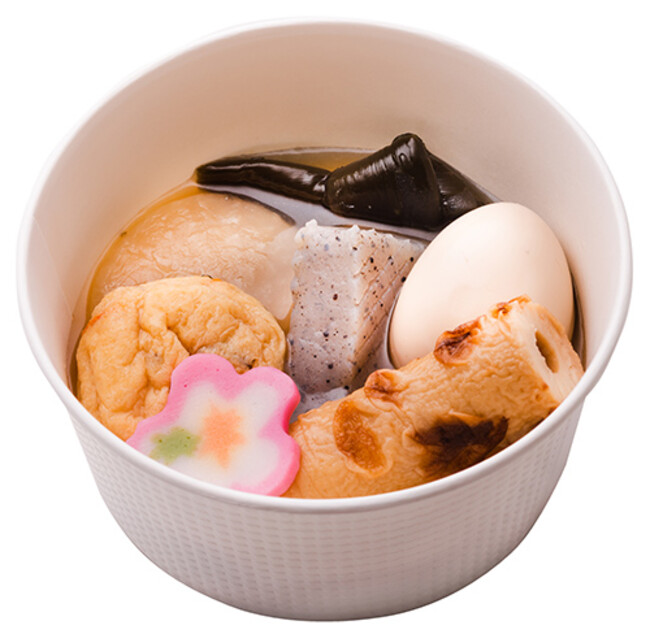 大根、玉子、昆布、こんにゃく、ちくわ、がんもどき、かまぼこをこだわりのかつお節だしでじっくりと煮込みました。