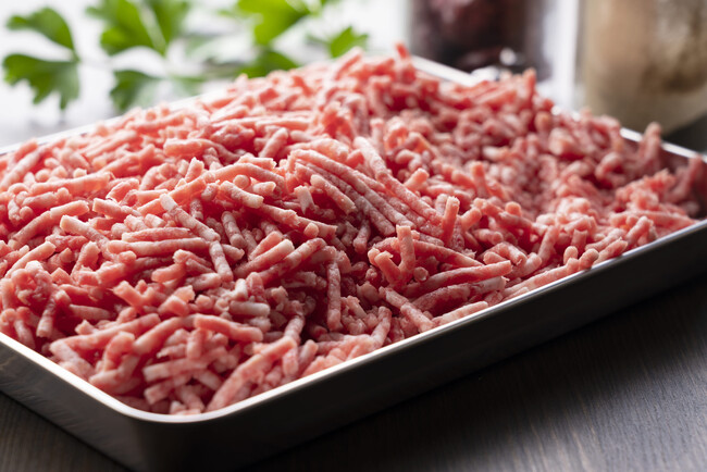 下味なし、つなぎなしの牛肉100%で 提供するため、厳選した素材を丁寧に挽いています。