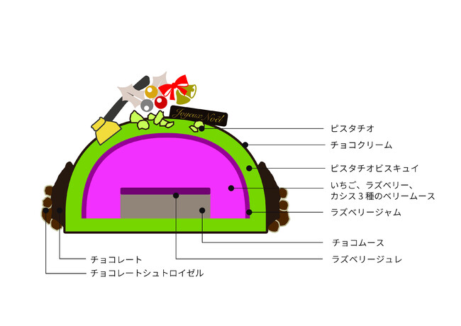 チョコレートクリームの切り株の中に、ピスタチオのビスキュイとミックスベリームースを閉じ込めたブッシュ・ド・ノエル。ラズベリージュレが酸味のアクセントを加えます。鮮やかなグリーンと燃えるような深紫の断層は煌びやかな宝石箱。まさに特別な日のための華やかなケーキです。