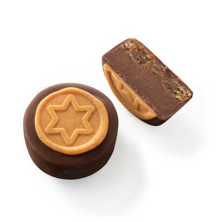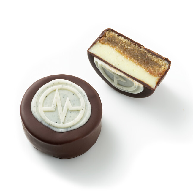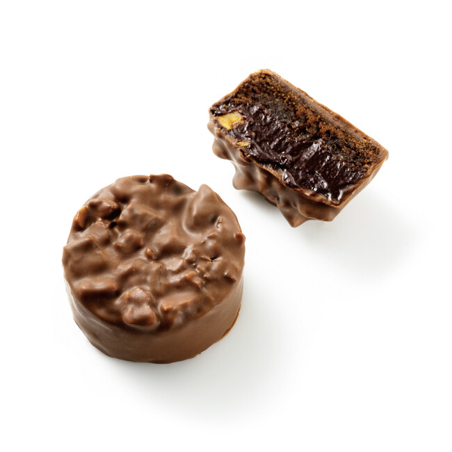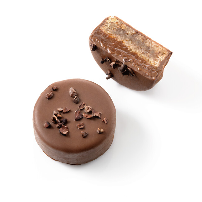 ヘーゼルナッツのビスケット生地にバニラのガナッシュを重ね、ダークチョコレートでコーティング。