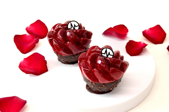 ビスキュイショコラにユズシロップ、ショコラのムースとエキゾチックなフルーツを重ね、ユズクリームを絞りルージュのナパージュで仕上げたミシャラクの代表作。モンクールとはフランス語で“私の心”という意味。真っ赤な薔薇を模したバレンタインにぴったりのケーキです。