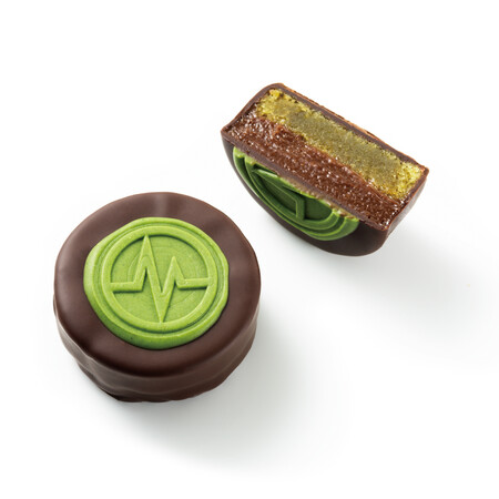 ピスタチオのビスケット生地に、キャラメルのガナッシュをのせ、ダークチョコレートでコーティング。チョコレート×ピスタチオの相性は抜群!