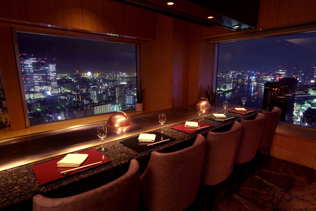 ホテル32階鉄板焼レストラン「華山」。夜の光の海が一面に広がる鉄板焼カウンター。