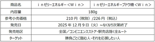 「inゼリー」ブランドは、受験や部活などのここぞという勝負事に挑む人たちを長年応援しており、「受験などの勝負ごとで、いつも隣にいる相棒でありたい、お守りのような存在でいたい」と考え、「inゼリー」の“in”を活かし、”Win”を訴求した特別パッケージ「inゼリーエネルギー<Win>」「inゼリーエネルギーブドウ糖<Win>」を2025年12月9日(火)より期間限定で再発売いたします。