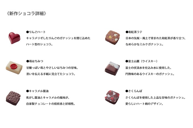 ロゴデザインの洗練されたシックな黒のボックスに、りんごのキャラメルガナッシュのハート型チョコレートを詰めたバレンタイン限定品。当店のスペシャリテであるパレドオールと一緒に、和紅茶や醤油などの「日本の素材」をテーマにした新作ショコラを詰め合わせました。ビターチョコレートのみならずホワイトチョコレートにいたるまでカカオ豆から手掛けて自社で製造するショコラティエならではのバラエティ豊かな「コフレ レザムール」は、東京・大阪・山梨の各店と公式オンラインショップでの限定販売品。大切な方への贈り物や、自分へのご褒美ショコラにおすすめの一品です。