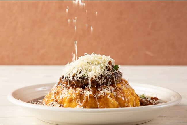 チーズの風味が強いパルメザンチーズをお客さまの目の前でたっぷりと削って仕上げます。ハワイの雪をイメージしたパフォーマンスは、見た目はもちろん味わいも豊かにします。