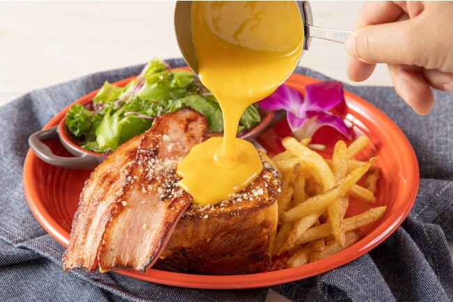 豚肉の旨みがぎゅっと凝縮されたジューシーで柔らかいイベリコ豚の燻製ベーコンを贅沢に2枚トッピング。甘いフレンチトースト×ベーコンの塩味が織りなす甘じょっぱさは一度食べるとやみつきに。