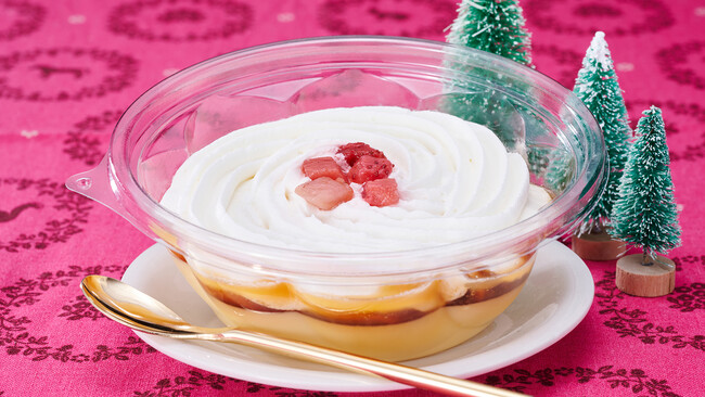 ホイップクリームをたっぷりと絞った、ボリュームのあるなめらか食感のプリンです。