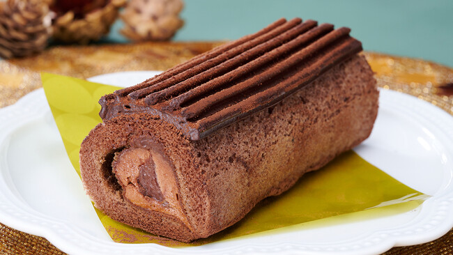 もっちり食感のスポンジケーキでチョコクリームとクーベルチュール入りの棒チョコを巻き込んだロールケーキです。