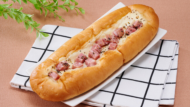 角切りの粗挽きポークソーセージとマヨネーズをトッピングし、ブラックペッパーをアクセントにしたボリューム系惣菜パンです。