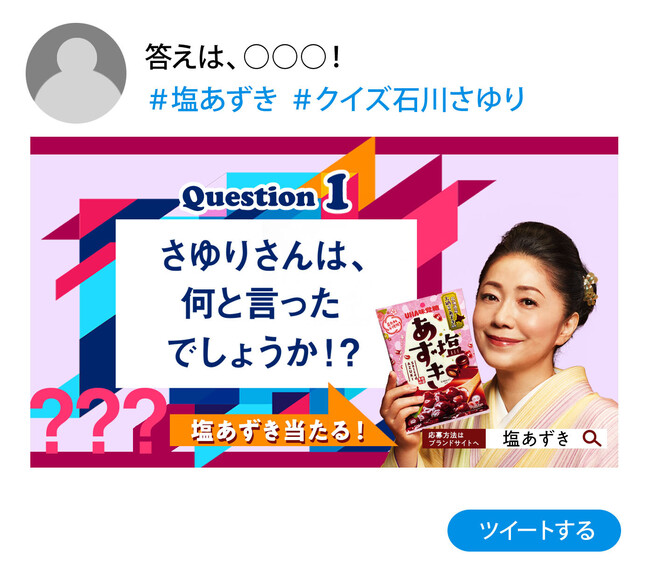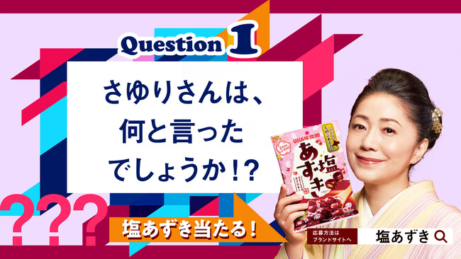 2022年10月29日(土)よりオンエアしている本格あずきの和風飴「塩あずき」のTVCM。そのCMキャラクターを務める石川さゆりさんから2つのクイズを出題!「石川さゆりさんが口パクで何と言っているか?」という歌の演出に紐づいたクイズです。答えをTwitterでつぶやけば「塩あずき」やUHA味覚糖の商品が抽選で当たるキャンペーンとなっています。
