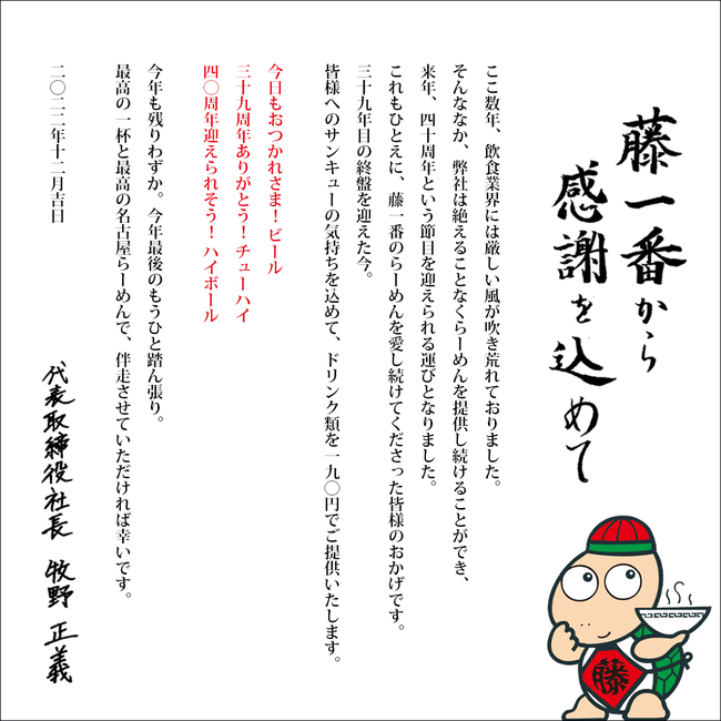 藤一番はコロナ禍でも絶えることなくらーめんを提供し続けることができ、来年、40周年の節目を迎えられる運びとなりました。これもひとえに、藤一番のらーめんを愛し続けてくださった皆様のおかげです。