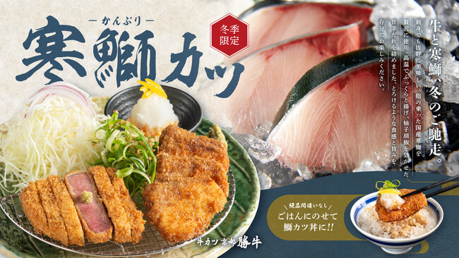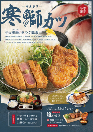 「牛ロースカツ膳」や「厚切り牛タンカツ膳」「牛ヒレカツ膳」などお好きなメニューにプラスして寒鰤カツをお楽しみいただけます。