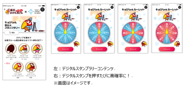 これらのうち2か所以上を回ると、デジタルスタンプを押すたびにルーレットチャンスに参加でき、東急リゾーツ&ステイが運営するスキー場でご利用いただけるスキー場リフト券が当たります。未訪問の設置場所でデジタルスタンプを押すたびに、ルーレットの当選確率は上がります。さらに5施設全てのスタンプを集めると、高確率で「DREAM SWEETS HOME」の宿泊券が当たるルーレットチャンスにも参加できます。皆様奮ってご参加ください。