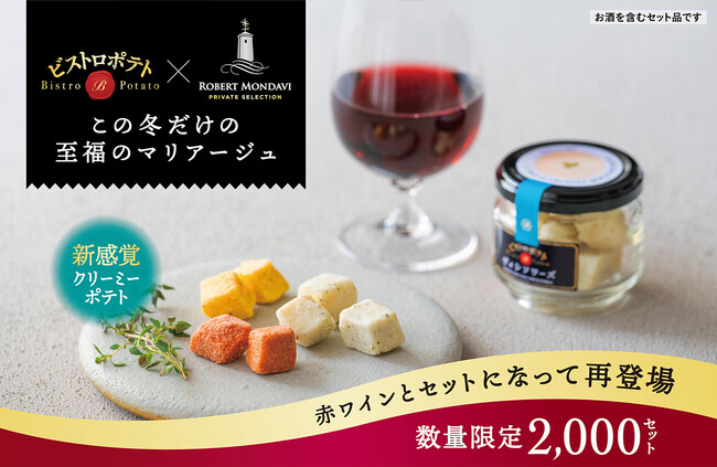 株式会社湖池屋(本社:東京都板橋区/社長:佐藤章)は、今年4月にオンラインショップ限定で発売し、その後1週間で完売した話題の新ジャンル「ビストロポテト」を、ワインのプロが厳選したワイン「ロバート・モンダヴィ バーボン・バレルエイジド カベルネ・ソーヴィニヨン」と特別なセット(「ワインとポテトとマリアージュセット」)にして、2022年12月1日(木)10時より湖池屋オンラインショップで販売を開始しました。
