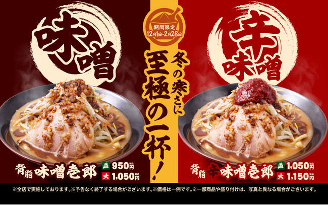 株式会社ガーデン(本社:東京都新宿区 代表取締役社長:川島賢 以下「当社」)が運営する「壱角家」は、2022年12月1日(木)から2023年2月28日(火)の期間限定で、『背脂味噌壱郎』と『背脂辛味噌壱郎』を壱角家店舗で販売いたします。