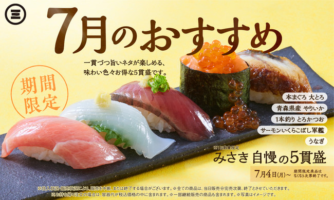 また、7月限定のおすすめ商品として「みさき 自慢の5貫盛」750円(税込825円)が登場します。期間限定でご提供している「青森県産 やりいか」「1本釣り とろかつお」「サーモンいくらこぼし軍艦」をはじめ、「本まぐろ 大とろ」や「うなぎ」を一貫ずつ盛り合わせ、お得に食べ比べいただける一皿をご用意しました。ぜひこの機会にこだわりの寿司をご賞味ください。