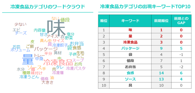 *母集団2.について、冷凍食品カテゴリの出現キーワードのランキングをみると、1位 味・2位 量・3位 冷凍食品と続いた。
