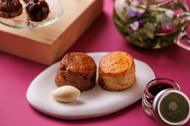 オリジナルレシピで焼き上げる自家製スコーンには、定番のプレーンに加え、バレンタイン期間限定で「堀川ごぼう×チョコレート」味が登場。自社農園で採れたハーブを使ったフレッシュハーブティーを含むオリジナルティーセレクションとともに、大切な方との優雅なティータイムをお過ごしください。