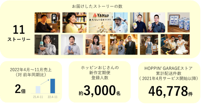 「HOPPIN' GARAGE」は、2021年4月のサービス開始以来、多くの魅力的な主人公と出会い、個性豊かなストーリービールを皆さまにお届けしてきました。「ホッピンおじさんの新作定期便」の登録人数は約3,000名となり、売上は前年比2倍まで成長しました。(注1)単品での購入をあわせた「HOPPIN' GARAGE」ストアの累計発送件数は、46,778件となりました。これまでは、8本・12本・24本セットを発売してきましたが、より少量で手軽に楽しみたいというお客様の声をいただき、この度6缶トライアルセットを発売することとなりました。