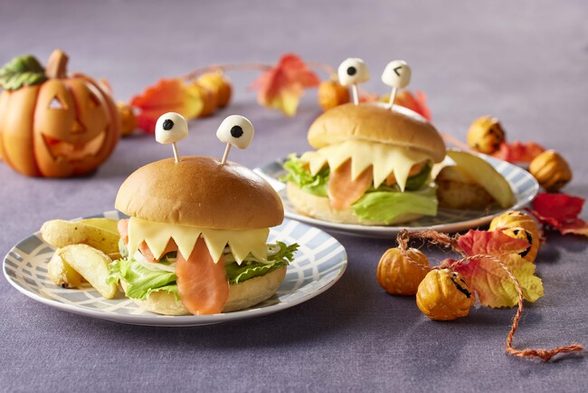 「スモークサーモン」「スライスチーズ」を使ってモンスター風にデコレーションをした面白バーガーです。